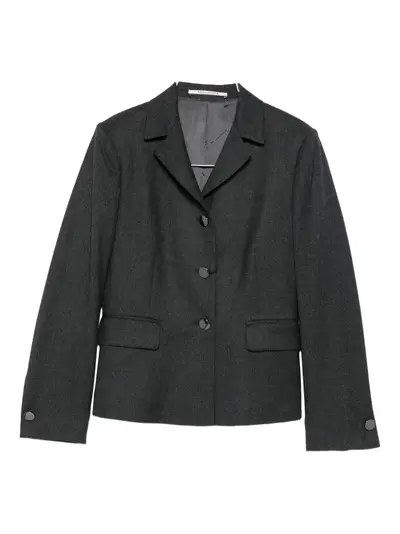 grey front button fastening front flap pockets long sleeves buttoned cuffs notched lapels