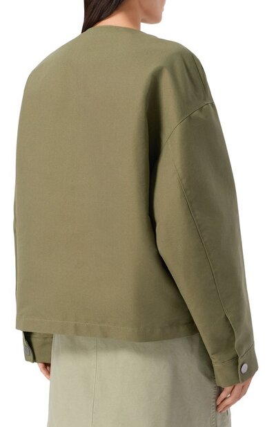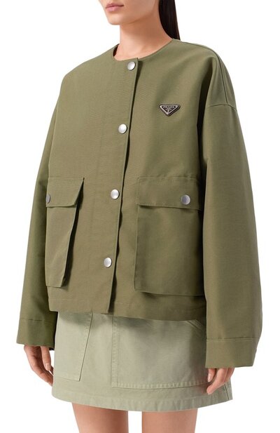 Oversize-куртку на контрастном вискозном подкладе выполнили из микса полиамида и хлопка. Принадлежность модели бренду подчеркнули фирменной треугольной пластиной. Изделие с круглым вырезом и накладными боковыми карманами застегивается молнией, скрытой под штормовой планкой на кнопках.
