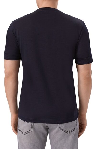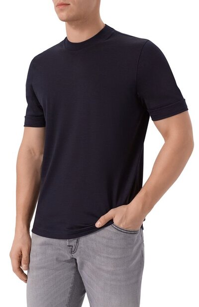 Для пошива футболки прямого кроя использовали тонкий шерстяной трикотаж. Модель с круглым вырезом и рукавами с отворотами легко впишется в базовый гардероб.