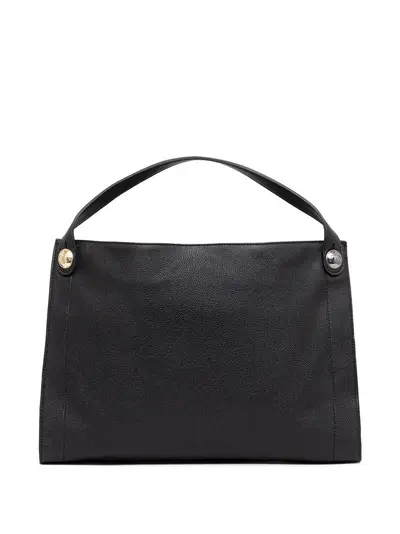black two top handles logo debossed grained texture internal zip-fastening pocket magnetic fastening