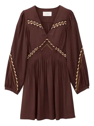 chocolate V-neck long sleeves embroidery gathered waist mini length