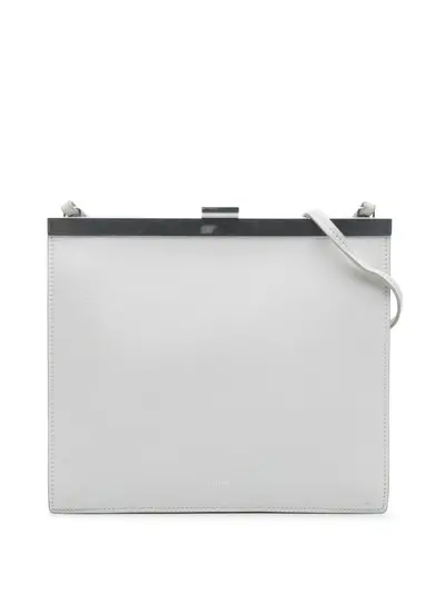 leather body flat leather strap open top with clasp closure interior slip pockets white Serial Number: U-SL-0168 This item has no inclusions. Condition: GOOD. This previously owned and used item is in good condition with minimal signs of use. This may include fading of material or plating and scratches. Please refer to the photos on this product page for a detailed view of the item, including any damages declared.