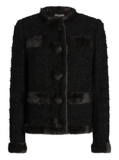 black tweed texture fur trim heart-shaped buttons flap pockets long sleeves