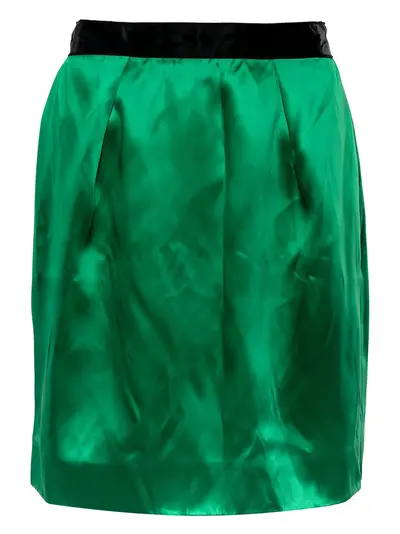 emerald green satin contrasting waistband pleated detailing front zip closure Condition: GOOD. This previously owned and used item is in good condition with minimal signs of use. This may include fading of material or plating and scratches.