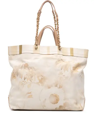 This tote bag features a printed canvas body, rolled leather handles, leather woven chain straps, an open top with a magnetic closure, and interior zip and slip pockets. Brown. Serial Number: 25190457. This item has no inclusions. Condition: GOOD. This previously owned and used item is in good condition with minimal signs of use. This may include fading of material or plating and scratches. Please refer to the photos on this product page for a detailed view of the item, including any damages declared.