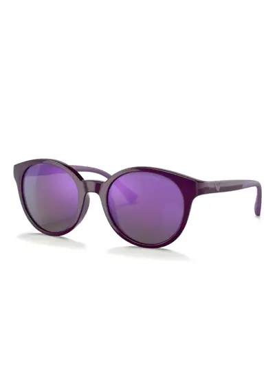purple round frame mirrored lenses nose pads logo detail two-tone arms These glasses come with a protective case.