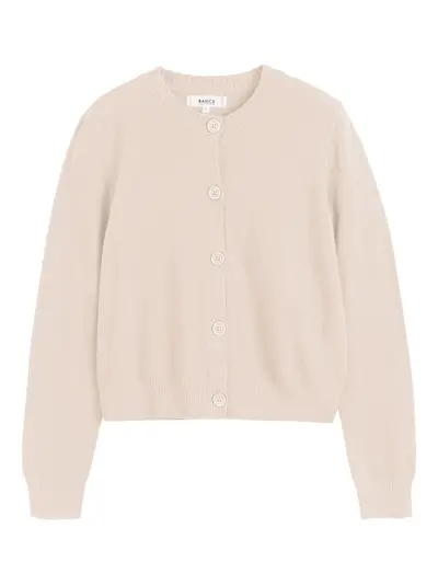bone beige front button fastening crew neck long sleeves ribbed hem and cuffs