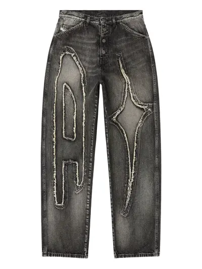 black cotton frayed edges concealed fly and button fastening contrast stitching logo detail