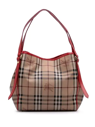 haymarket check coated canvas body with leather trim flat leather straps open top with magnetic snap closure interior zip and slip pockets pouch inclusion brown Inclusions: pouch. Condition: GOOD. This previously owned and used item is in good condition with minimal signs of use. This may include fading of material or plating and scratches. Declared Damages: Handle/Strap Feature(s) Minor Splitting. Please refer to the photos on this product page for a detailed view of the item, including any damages declared.
