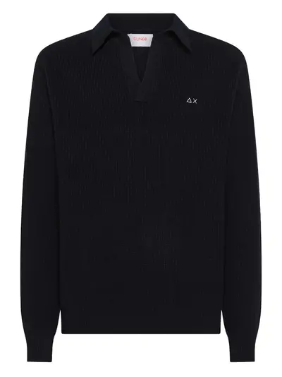 dark blue ribbed knit V-neck logo detail long sleeves polo collar
