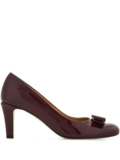 plum purple rounded toe bow detail gold-tone buckle leather sole mid block heel