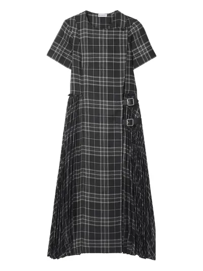 dark grey check pattern pleated skirt wrap silhouette short sleeves buckle straps