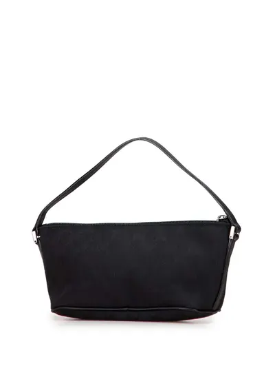 This shoulder bag features a canvas body with leather trim, a flat leather strap, and a top zip closure. Black. Serial Number: 039・1103 2123. This item has no inclusions. Condition: EXCELLENT. This previously owned item is in near-perfect condition with no signs of damage or use. Please refer to the photos on this product page for a detailed view of the item, including any damages declared.