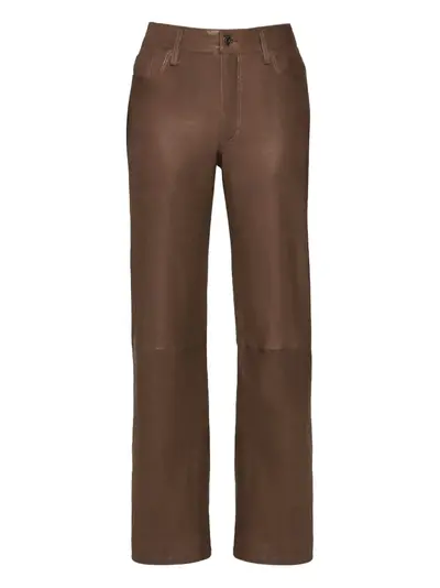 brown front button closure classic five-pocket design rear patch pockets stitched detailing