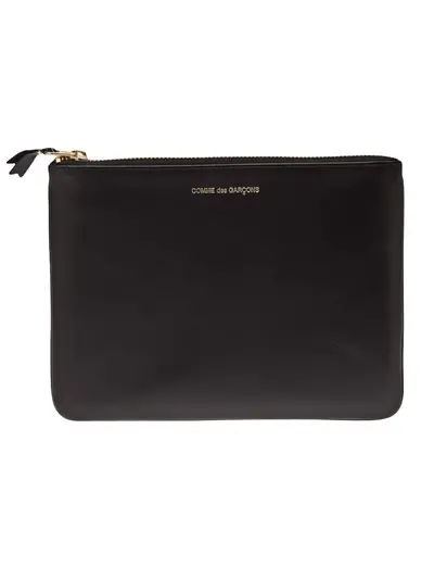 Black cowhide large basic wallet from Comme des Garçons Wallet featuring a top gold-tone zipper closure, and embossed gold exterior logo. Measure: 6" L x 8.5" W.