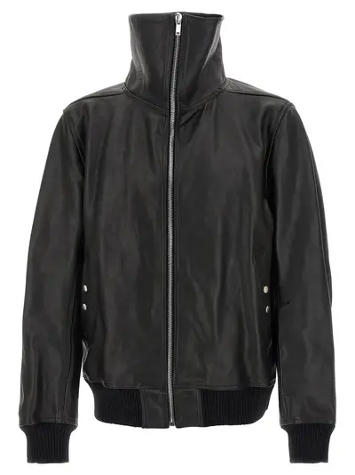 black calf leather front-zip closure foldable turtleneck ribbed knit cuffs ribbed knit hem pockets