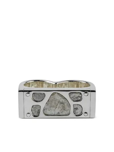 silver-tone sterling silver diamond embellished totaling 5.0 carats double band engraved logo Normal everyday use and external agents may reduce the lustre of gemstones and gold surfaces. To maintain, use specific, non-abrasive products specially meant for cleaning jewellery.