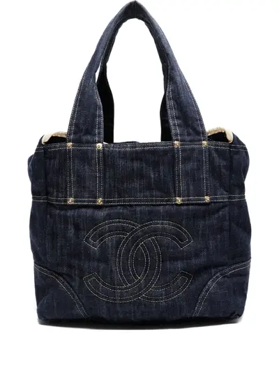 2005-2006 navy blue 10370795 cc logo top handle gold-tone hardware topstitched detailing internal slip pocket Condition: GOOD. This previously owned and used item is in good condition with minimal signs of use. This may include fading of material or plating and scratches.