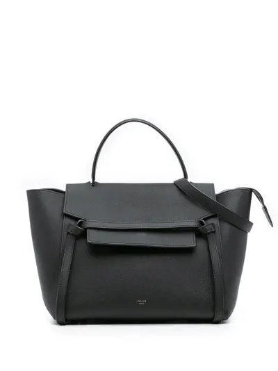 The Belt bag features a leather body, a flat leather top handle, a detachable leather shoulder strap, a front flap with slip-through and top zip closure, an exterior back zip pocket, and interior slip pockets. Black. Serial Number: F-CU-2146. Inclusions: shoulder strap, dust bag. Condition: EXCELLENT. This previously owned item is in near-perfect condition with no signs of damage or use. Please refer to the photos on this product page for a detailed view of the item, including any damages declared.