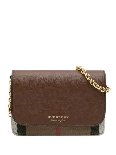 The Hampshire Wallet on Chain features a house check canvas and leather body, a chain link with an adjustable flat leather strap, a front flap with magnetic snap closure, an exterior back slip pocket, and interior zip and slip pockets. Brown. Serial Number: MDICSSTU75CHI. Inclusions: shoulder strap, dust bag. Condition: EXCELLENT. This previously owned item is in near-perfect condition with no signs of damage or use. Please refer to the photos on this product page for a detailed view of the item, including any damages declared.