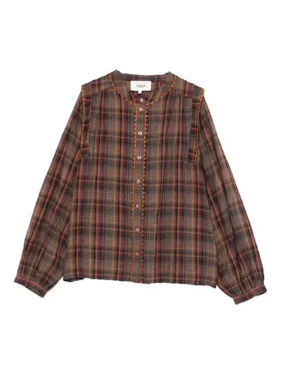 brown plaid check pattern front button fastening long sleeves round neck