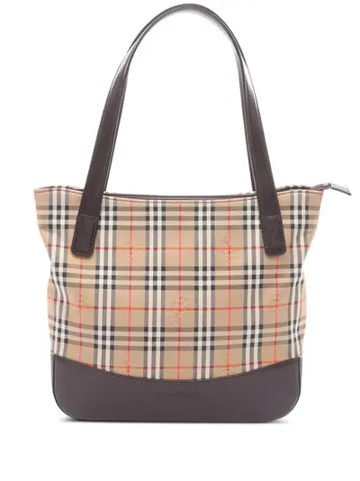 haymarket check canvas body with leather trim and bottom flat leather handles top zip closure interior zip and slip pockets brown This item has no inclusions. Condition: GOOD. This previously owned and used item is in good condition with minimal signs of use. This may include fading of material or plating and scratches. Due to the exclusivity of this item and its limited availability, processing and delivery might take longer than usual. Declared Damages: Interior Lining Feature(s) Minor Peeling. Please refer to the photos on this product page for a detailed view of the item, including any damages declared.