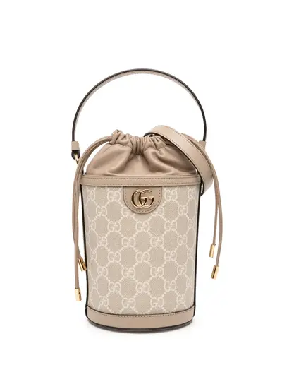 This bucket bag features a coated canvas body with leather trim, a flat leather handle, an adjustable and detachable strap, an open top with drawstring closure, and interior slip pockets. Brown. Serial Number: 760199 525040. Inclusions: dust bag, shoulder strap. Condition: EXCELLENT. This previously owned item is in near-perfect condition with no signs of damage or use. Please refer to the photos on this product page for a detailed view of the item, including any damages declared.