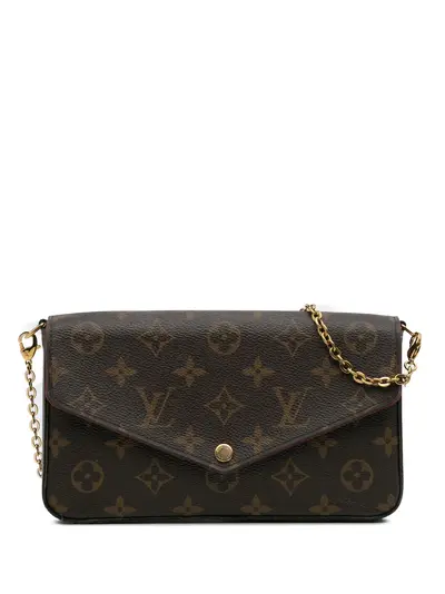 The Pochette Felicie crossbody bag features a monogram canvas body, a detachable gold-tone chain shoulder strap, a top flap with snap closure, and detachable pouch inclusions. Brown. Serial Number: MI1117. Inclusions: pouch. Condition: EXCELLENT. This previously owned item is in near-perfect condition with no signs of damage or use. Please refer to the photos on this product page for a detailed view of the item, including any damages declared.