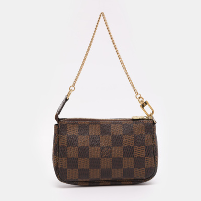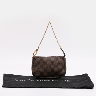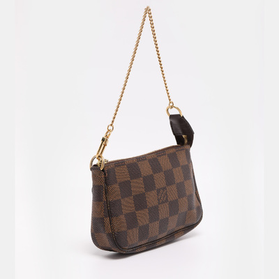 Compact yet versatile, this Mini Pochette is crafted from Louis Vuitton’s signature Damier Ebene canvas. With its secure zip closure and chain strap, it easily transitions from a pouch inside a larger tote to a chic evening accessory.