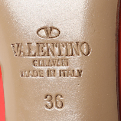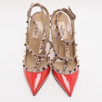 Rendered in orange patent and beige leather, these Rockstud pumps bring a vibrant lift to Valentino’s signature studded cage design. Sleek straps and a sharp heel add definition to the lively mix.