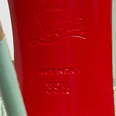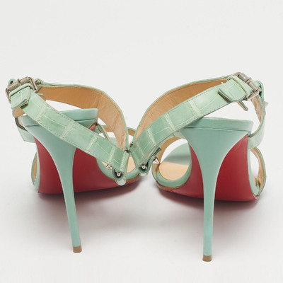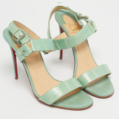 Exotic and glamorous, these Christian Louboutin Sova sandals are crafted from genuine green alligator leather for a bold luxury statement. The sleek ankle strap and high heel add elegance, while the signature red sole completes the iconic look. Perfect for elevating sophisticated evening ensembles.