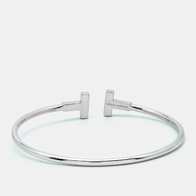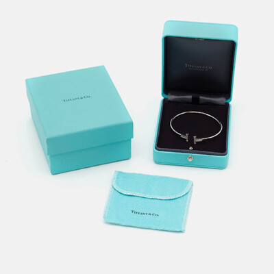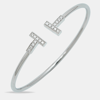 From the iconic Tiffany T collection, this bracelet in 18k white gold showcases clean, architectural lines illuminated by pavé diamonds. The open T wire design offers both structure and modernity, reflecting Tiffany’s signature minimalism. Its understated brilliance allows effortless wear, whether stacked with other bangles or worn as a standalone statement of timeless elegance.