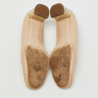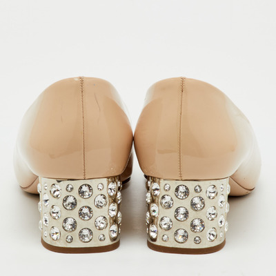 These preloved Miu Miu pumps balance glossy beige patent leather with crystal embellished block heels, bringing sparkle to an otherwise neutral palette. They’re a comfortable yet elevated choice for evenings when you want shine without sacrificing ease.