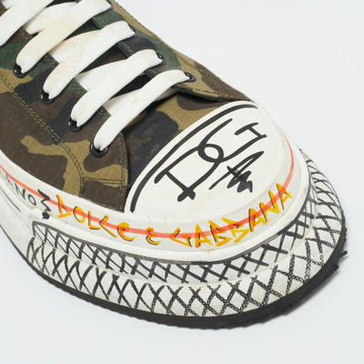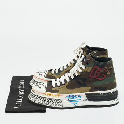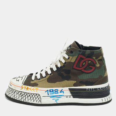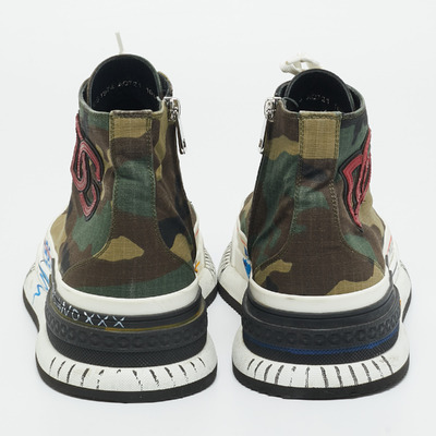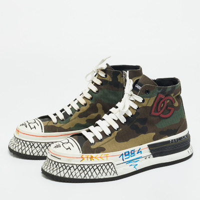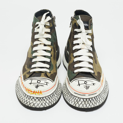 Make a statement in these Dolce and Gabbana high top sneakers clad in bold green camouflage canvas. The lace up design offers a secure fit with standout street style character. A must have for trend led wardrobes.