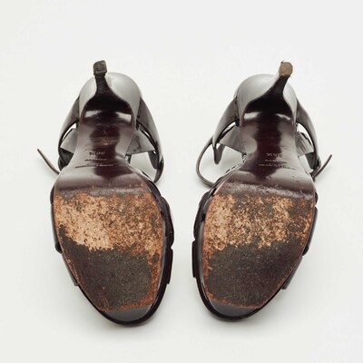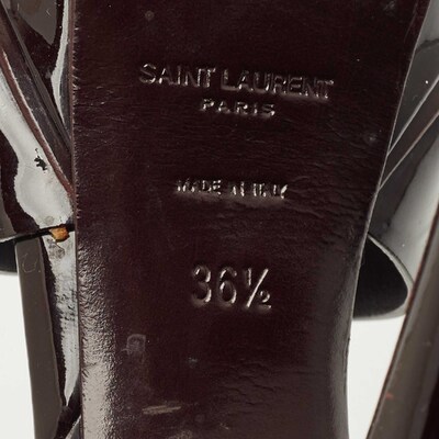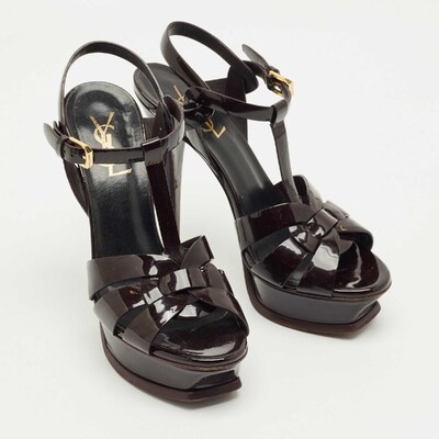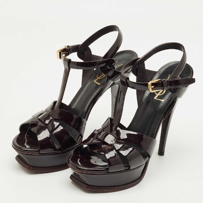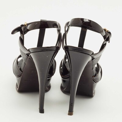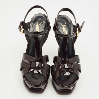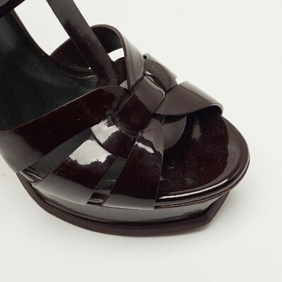 A timeless aesthetic and stellar craftsmanship in shoemaking are evident in these Yves Saint Laurent platform sandals. From their interwoven construction using patent leather to the sturdy heels supported by platforms, these black hued Tribute sandals can be styled with numerous outfits.