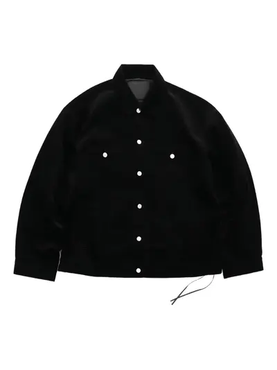 black corduroy texture button closure welt pockets drawstring hem embroidered skull