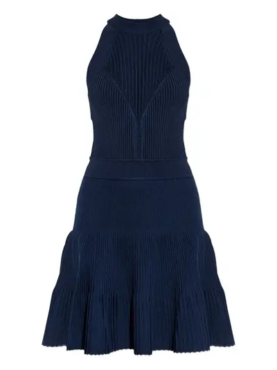 dark blue ribbed knit halter neck pleated skirt cutaway shoulders band detail