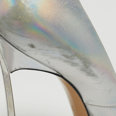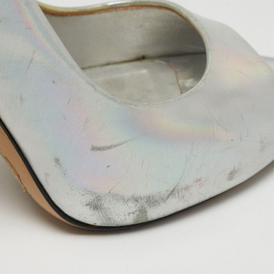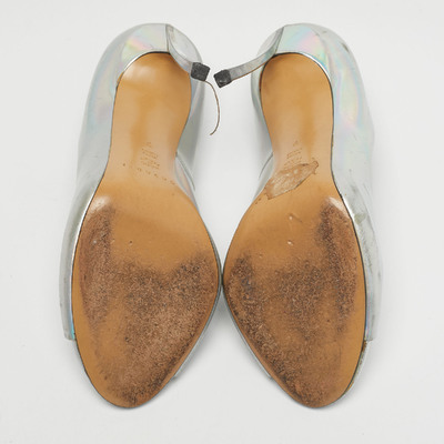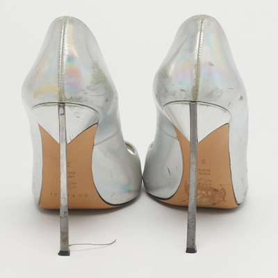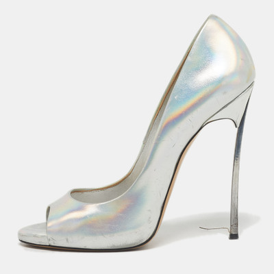 These preloved Casadei pumps are cut in silver leather with a peep toe and high heel. Their mirrored finish has a sleek character that makes them easy to style with everything from evening gowns to sharp tailoring.