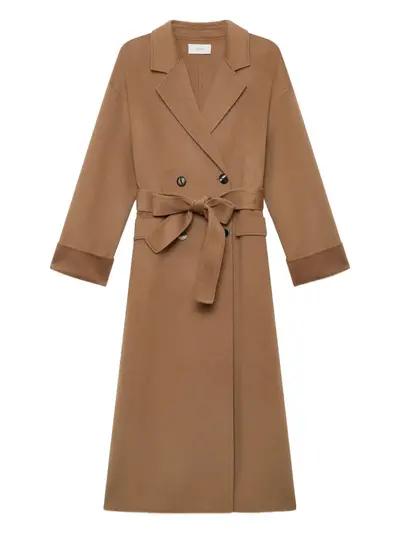 camel double-breasted fastening self-tie belt notched lapel long sleeves cuffed sleeves