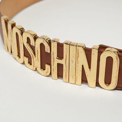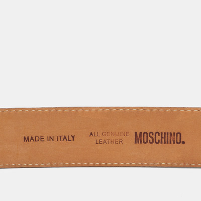 Moschino gives a bold twist to everyday styling with this brown leather belt. Its surface sets the stage for the brand’s unmistakable gold tone logo letters—instantly recognizable and full of character.