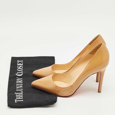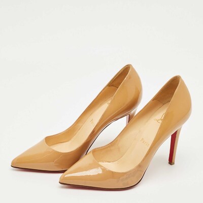 The Pigalle pumps are rendered in glossy beige patent leather with a pointed toe and slender stiletto heel. A true Louboutin classic, they bring instant polish to both day and evening looks.