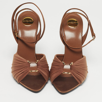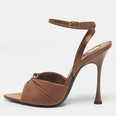 These Lola sandals in brown satin feel made for evenings that linger. The soft folds gather around golden rings, giving them a touch of drama without excess. With their slender ankle straps and high heels, they balance ease and allure in every step.