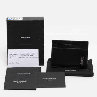 Sleek and minimalist, this Saint Laurent Tiny Cassandre card holder is crafted from smooth black leather with the iconic YSL logo. Compact yet functional, it’s perfect for organizing essentials while adding a touch of luxury to everyday carry. Ideal for both casual and formal occasions.