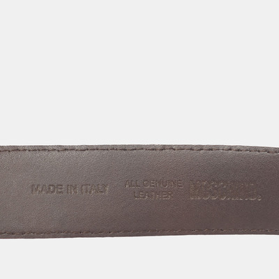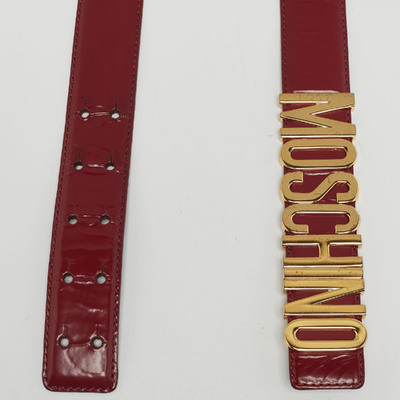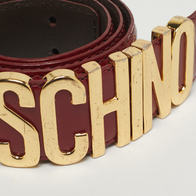 Moschino gives a bold twist to everyday styling with this burgundy glossy leather belt. Its surface sets the stage for the brand’s unmistakable gold tone logo buckle—instantly recognizable and full of character.
