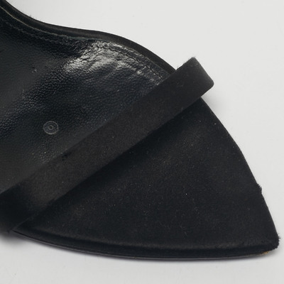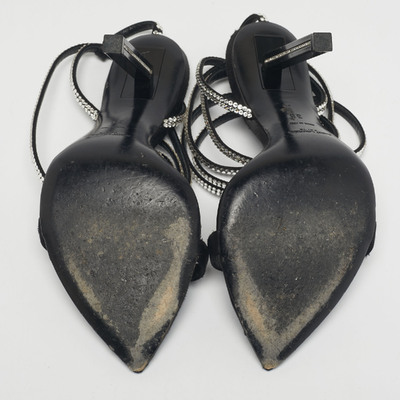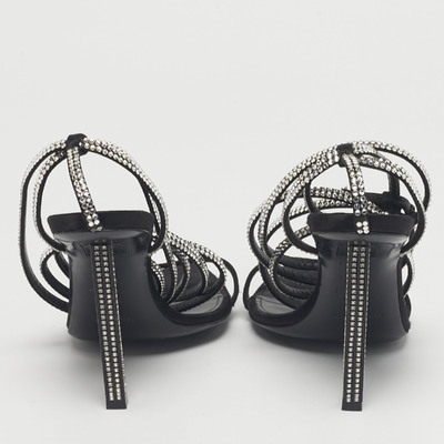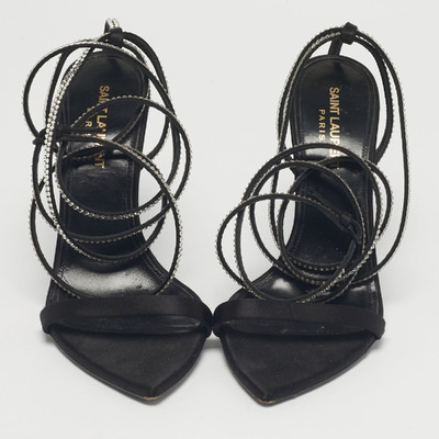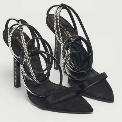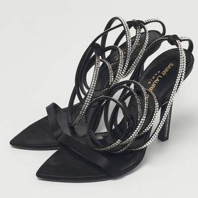 These Saint Laurent Georgia sandals bring drama in black satin with crystal lined straps and a slender stiletto. The wraparound ankle tie shimmers like jewelry, while the heel itself is traced with crystals for extra brilliance. These womens stylish ankle strap sandals transform evening wear into a showpiece.