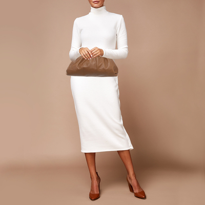 Bottega Veneta’s clutch epitomizes modern minimalism, defined by its supple brown leather and voluminous gathered silhouette. Devoid of excess detailing, it relies on pure form and craftsmanship to make a statement. A favorite among contemporary icons, this piece embodies understated luxury, lending itself to versatile day to night styling.