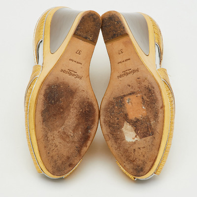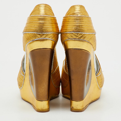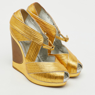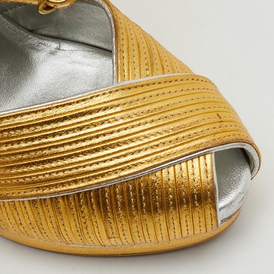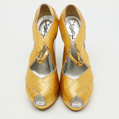 Yves Saint Laurent Metallic Gold Leather Peep Toe Platform Wedge Pumps Size 37 1222732 (lpn31019708)