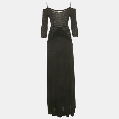 Elisabetta Franchi crafts this off shoulder maxi dress in black perforated knit, combining texture and sensuality. The body skimming cut and openwork panels make it perfect for evening events. Keep accessories minimal to highlight its architectural lines.