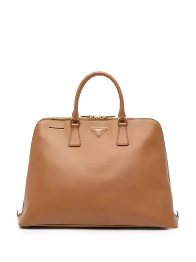saffiano leather body rolled leather handles double zip around closure interior center zip compartment interior zip and slip pockets brown This item has no inclusions. Condition: GOOD. This previously owned and used item is in good condition with minimal signs of use. This may include fading of material or plating and scratches. Declared Damages: Handle/Strap Feature(s) Minor Loose Stitching. Interior Pocket Feature(s) Minor Loose Stitching. Please refer to the photos on this product page for a detailed view of the item, including any damages declared.