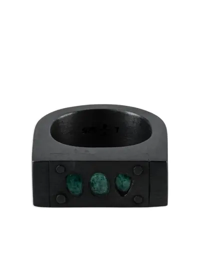 black oxidised finish emerald embellishment totalling 0.4 carats Normal everyday use and external agents may reduce the lustre of gemstones and gold surfaces. To maintain, use specific, non-abrasive products specially meant for cleaning jewellery.